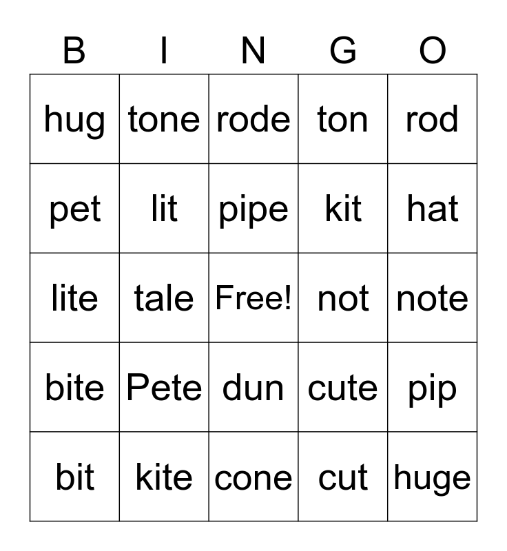 This bingo card has a free space and 29 words: bit, con, tale, hate, hug, rode, lit, Pete, not, kite, note, huge, cone, cut, hat, tall, dun, bite, rod, lite, cute, dune, kit, pet, ton, tone, pip, pipe and had.