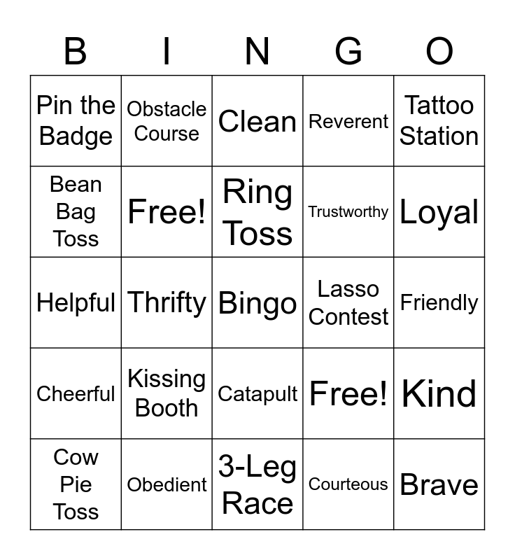 This bingo card has 25 words: Kissing Booth, 3-Leg Race, Ring Toss, Cow Pie Toss, Tattoo Station, Pin the Badge, Bean Bag Toss, Obstacle Course, Lasso Contest, Catapult, Trustworthy, Helpful, Free!, Kind, Free!, Brave, Friendly, Clean, Loyal, Thrifty, Bingo, Obedient, Cheerful, Reverent and Courteous.
