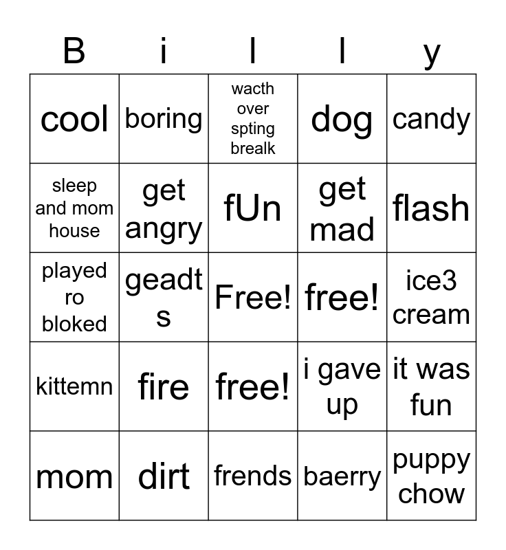 This bingo card has a free space and 24 words: fire, dirt, fUn, mom, candy, cool, sleep and mom house, boring, free!, free!, get mad, played ro bloked, i gave up, it was fun, get angry, baerry, ice3 cream, wacth over spting brealk, flash, geadt s, puppy chow, kittemn, dog and frends.