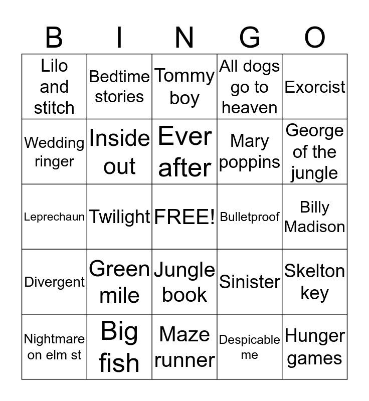 This bingo card has a free space and 24 words: Green mile, Big fish, Ever after, Nightmare on elm st, Exorcist, Lilo and stitch, Wedding ringer, Bedtime stories, Bulletproof, Jungle book, Mary poppins, Leprechaun, Sinister, Skelton key, Inside out, Despicable me, Billy Madison, Tommy boy, George of the jungle, Twilight, Hunger games, Divergent, All dogs go to heaven and Maze runner.