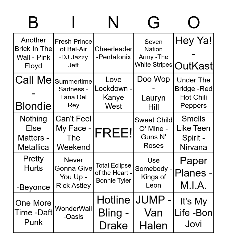 This bingo card has a free space and 24 words: Never Gonna Give You Up - Rick Astley, WonderWall -Oasis, Love Lockdown - Kanye West, One More Time -Daft Punk, Hey Ya! - OutKast, Another Brick In The Wall - Pink Floyd, Call Me - Blondie, Fresh Prince of Bel-Air -DJ Jazzy Jeff, Sweet Child O' Mine - Guns N' Roses, Total Eclipse of the Heart - Bonnie Tyler, Doo Wop - Lauryn Hill, Nothing Else Matters - Metallica, Use Somebody - Kings of Leon, Paper Planes - M.I.A., Summertime Sadness - Lana Del Rey, JUMP - Van Halen, Smells Like Teen Spirit - Nirvana, Cheerleader -Pentatonix, Under The Bridge -Red Hot Chili Peppers, Can't Feel My Face - The Weekend, It's My Life -Bon Jovi, Pretty Hurts -Beyonce, Seven Nation Army -The White Stripes and Hotline Bling - Drake.