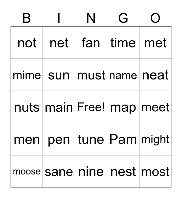 This bingo card has a free space and 34 words: moon, nest, tomb, noon, men, sun, met, moose, net, mutt, must, fan, tame, nap, map, neat, sane, nuts, pen, Pam, tune, mine, not, meet, nine, most, time, night, name, mime, fine, main, might and line.