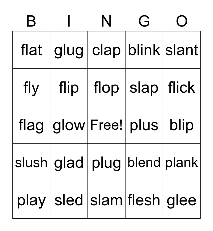 This bingo card has a free space and 29 words: play, blast, glow, slot, flat, clap, flip, glad, plus, sled, blip, glee, slam, flesh, flick, plant, plug, slush, slant, flag, blend, glue, slap, fly, blink, glug, plank, flop and slip.