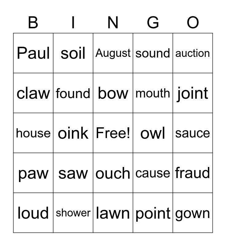 This bingo card has a free space and 24 words: saw, shower, bow, loud, auction, Paul, claw, soil, owl, ouch, mouth, house, cause, fraud, found, point, sauce, August, joint, oink, gown, paw, sound and lawn.