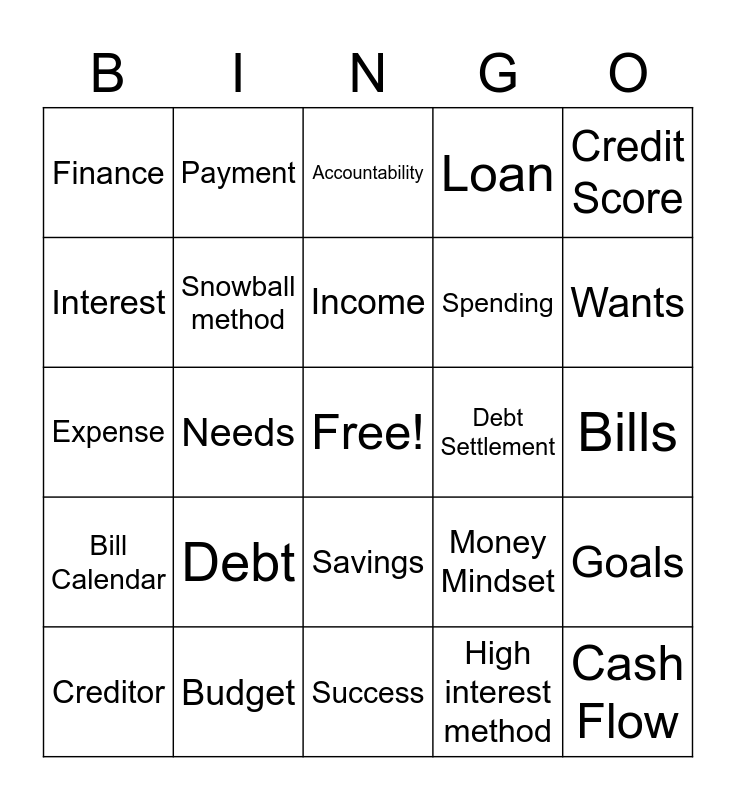 This bingo card has a free space and 24 words: Debt, Budget, Income, Creditor, Credit Score, Finance, Interest, Payment, Debt Settlement, Savings, Spending, Expense, Money Mindset, Goals, Snowball method, High interest method, Bills, Accountability, Wants, Needs, Cash Flow, Bill Calendar, Loan and Success.
