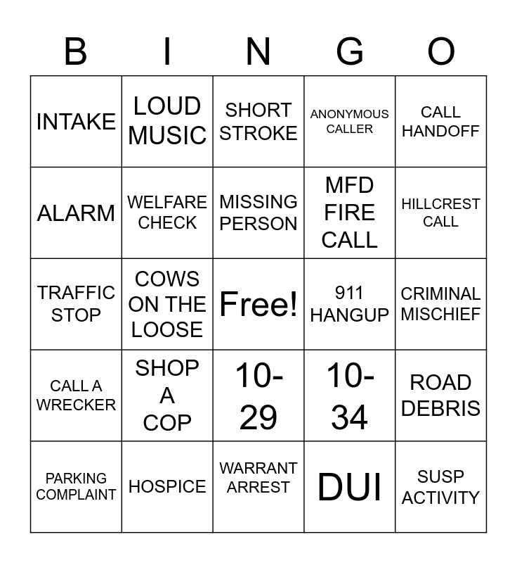 This bingo card has a free space and 24 words: SHOP A COP, HOSPICE, MISSING PERSON, PARKING COMPLAINT, CALL HANDOFF, INTAKE, ALARM, LOUD MUSIC, 911 HANGUP, 10-29, MFD FIRE CALL, TRAFFIC STOP, 10-34, ROAD DEBRIS, WELFARE CHECK, DUI, CRIMINAL MISCHIEF, SHORT STROKE, HILLCREST CALL, COWS ON THE LOOSE, SUSP ACTIVITY, CALL A WRECKER, ANONYMOUS CALLER and WARRANT ARREST.