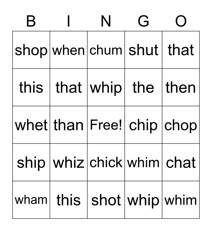 This bingo card has a free space and 24 words: whiz, this, whip, wham, that, shop, this, when, chip, chick, the, whet, whim, chat, that, whip, chop, chum, then, than, whim, ship, shut and shot.