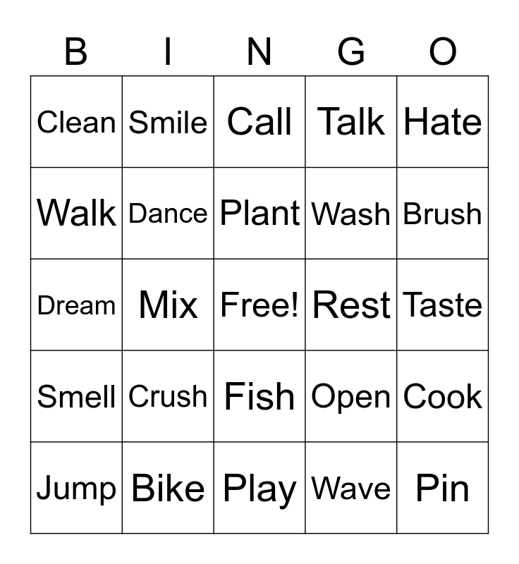 This bingo card has a free space and 24 words: Crush, Bike, Plant, Jump, Hate, Clean, Walk, Smile, Rest, Fish, Wash, Dream, Open, Cook, Dance, Wave, Taste, Call, Brush, Mix, Pin, Smell, Talk and Play.