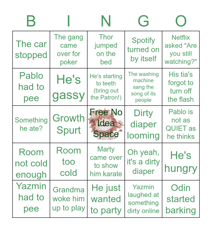 This bingo card has a free space and 29 words: Yazmin had to pee, Emma sneezed, Growth Spurt, The phone rang, The car stopped, Thor jumped on the bed, He's gassy, Room too cold, Dirty diaper looming, Grandma woke him up to play, Pablo is not as QUIET as he thinks, Odin started barking, He just wanted to party, Yazmin laughed at something dirty online, His tia's forgot to turn off the flash, Martin thought it would be funny to take a picture of him with beer, Marty came over to show him karate, Room not cold enough, Netflix asked "Are you still watching?", Something he ate?, Oh yeah, it's a dirty diaper, Erik wanted to show him his Spidey moves, The washing machine sang the song of its people, Pablo had to pee, Spotify turned on by itself, The gang came over for poker, He's hungry, He's starting to teeth (bring out the Patron!) and Mom and dad want to sleep later too!.