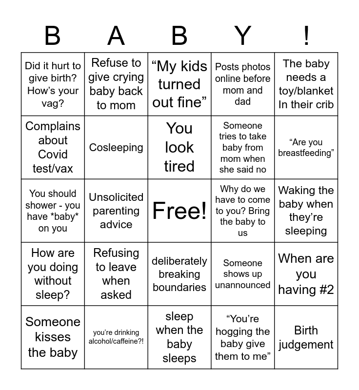This bingo card has a free space and 24 words: Someone kisses the baby, Refusing to leave when asked, You look tired, “You’re hogging the baby give them to me”, The baby needs a toy/blanket In their crib, Did it hurt to give birth? How’s your vag?, Refuse to give crying baby back to mom, “My kids turned out fine”, Why do we have to come to you? Bring the baby to us, Waking the baby when they’re sleeping, You should shower - you have *baby* on you, Cosleeping, Someone shows up unannounced, When are you having #2, Complains about Covid test/vax, you’re drinking alcohol/caffeine?!, sleep when the baby sleeps, Posts photos online before mom and dad, “Are you breastfeeding”, How are you doing without sleep?, Unsolicited parenting advice, deliberately breaking boundaries, Someone tries to take baby from mom when she said no and Birth judgement.