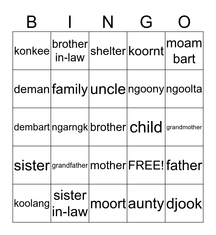 This bingo card has 25 words: grandfather, moort, uncle, koolang, moam bart, konkee, deman, brother in-law, child, mother, ngoony, dembart, FREE!, father, family, djook, grandmother, shelter, ngoolta, ngarngk, brother, sister in-law, sister, koornt and aunty.