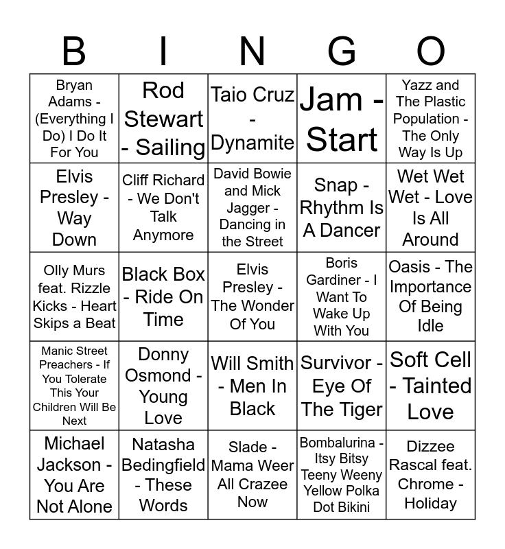 This bingo card has 46 words: FREE!, Elvis Presley - The Wonder Of You, Diana Ross - I'm Still Waiting, Slade - Mama Weer All Crazee Now, Donny Osmond - Young Love, Osmonds - Love Me For A Reason, Rod Stewart - Sailing, ABBA - Dancing Queen, Elvis Presley - Way Down, Commodores - Three Times A Lady, Cliff Richard - We Don't Talk Anymore, Jam - Start, Soft Cell - Tainted Love, Survivor - Eye Of The Tiger, UB40 - Red Red Wine, Stevie Wonder - I Just Called To Say I Love You, David Bowie and Mick Jagger - Dancing in the Street, Boris Gardiner - I Want To Wake Up With You, Rick Astley - Never Gonna Give You Up, Yazz and The Plastic Population - The Only Way Is Up, Black Box - Ride On Time, Bombalurina - Itsy Bitsy Teeny Weeny Yellow Polka Dot Bikini, Bryan Adams - (Everything I Do) I Do It For You, Snap - Rhythm Is A Dancer, Culture Beat - Mr Vain, Wet Wet Wet - Love Is All Around, Michael Jackson - You Are Not Alone, Spice Girls - Wannabe, Will Smith - Men In Black, Manic Street Preachers - If You Tolerate This Your Children Will Be Next, Lou Bega - Mambo No 5, A1 - Take On Me, Blue - Too Close, Atomic Kitten - The Tide Is High, Elton John - Are You Ready For Love?, Natasha Bedingfield - These Words, Oasis - The Importance Of Being Idle, Justin Timberlake - Sexyback, Sean Kingston - Beautiful Girls, Katy Perry - I Kissed A Girl, Dizzee Rascal feat. Chrome - Holiday, Taio Cruz - Dynamite, Olly Murs feat. Rizzle Kicks - Heart Skips a Beat, Little Mix - Wings, Ellie Goulding - Burn and Lilly Wood and Robin Schulz - Prayer In C (Robin Schulz Remix).