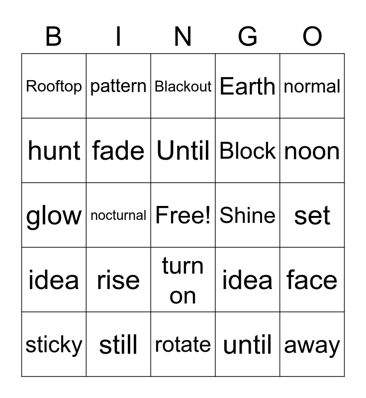 This bingo card has a free space and 29 words: Work, still, Blackout, player, normal, Rooftop, fade, Until, Shine, face, sticky, nocturnal, until, away, glow, Flashlight, rotate, idea, noon, idea, rise, buddy, Block, set, hunt, pattern, turn on, Earth and whole.