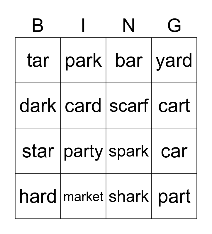 This bingo card has 16 words: market, car, bar, tar, star, park, spark, shark, dark, card, hard, yard, party, cart, scarf and part.