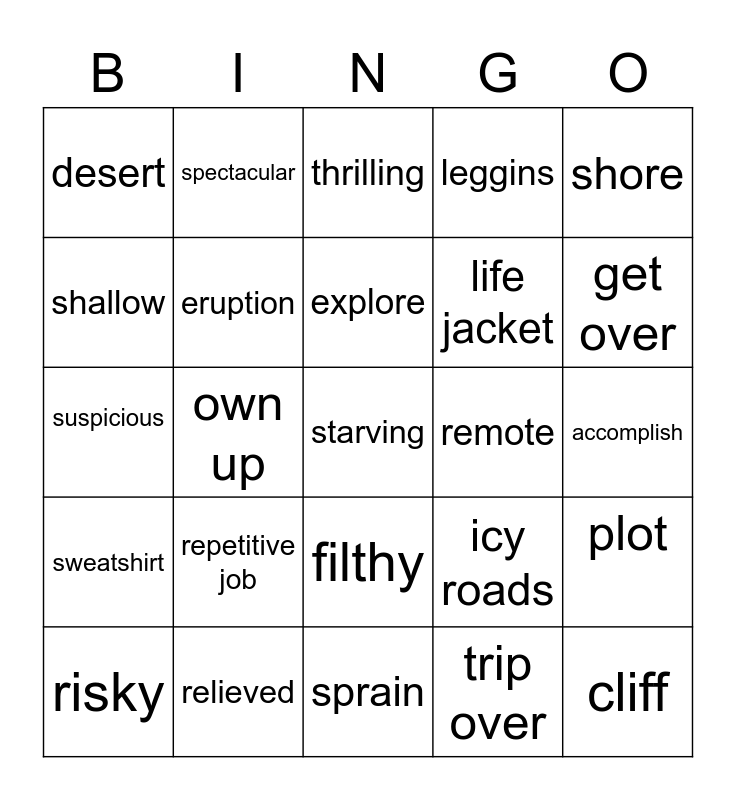 This bingo card has 25 words: repetitive job, sprain, explore, risky, shore, desert, shallow, spectacular, remote, filthy, life jacket, suspicious, icy roads, plot, eruption, cliff, accomplish, thrilling, get over, own up, starving, relieved, sweatshirt, leggins and trip over.