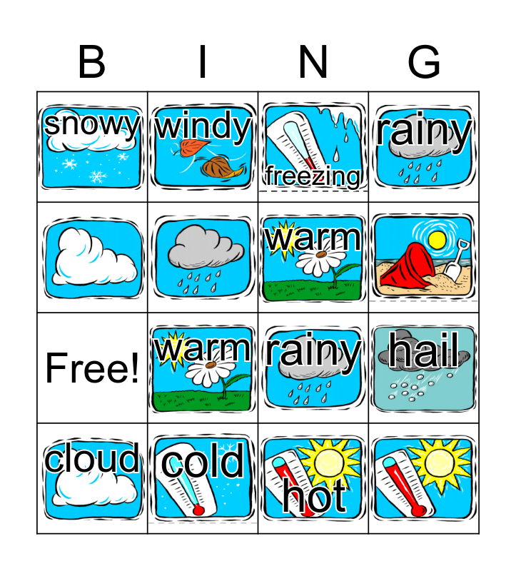 This bingo card has 19 images and 15 words: cloud, stormy, freezing, hail, sunny, warm, hot, rainy, Free!, windy, rainy, snowy, cold, warm and cloudy.