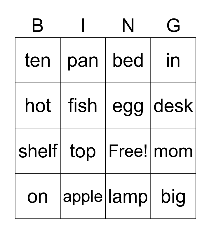 This bingo card has 21 words: apple, cap, pan, bag, lamp, egg, ten, bed, Free!, desk, shelf, in, big, sit, fish, kitchen, on, top, hot, mom and closet.
