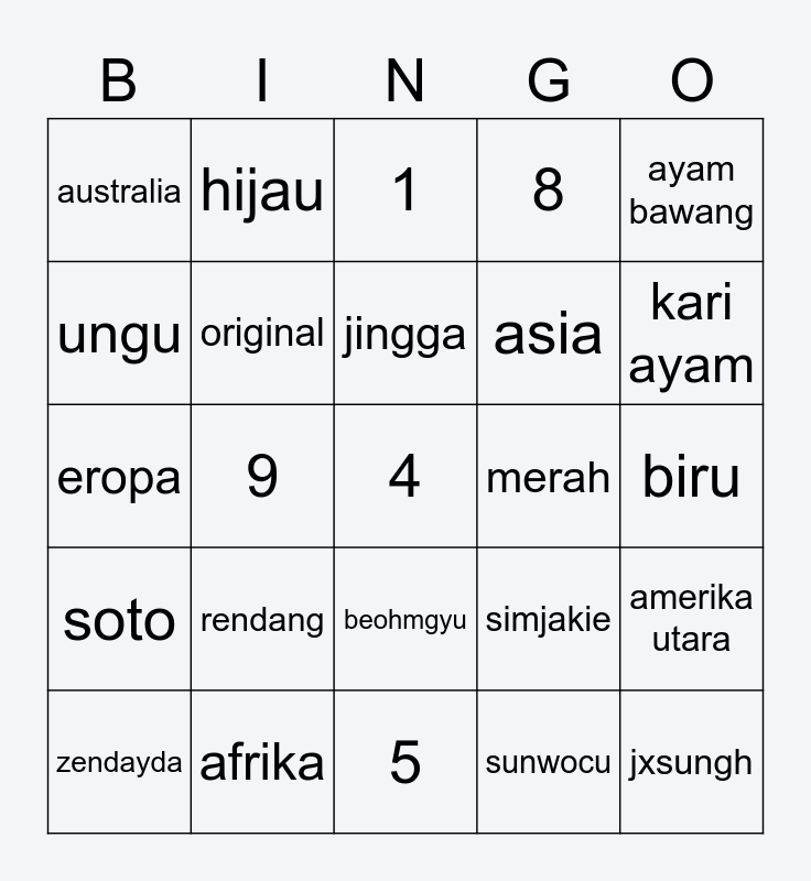 This bingo card has 25 words: soto, afrika, 4, sunwocu, ayam bawang, australia, hijau, 1, merah, amerika utara, ungu, original, 5, simjakie, kari ayam, zendayda, 9, jingga, asia, biru, eropa, rendang, beohmgyu, 8 and jxsungh.