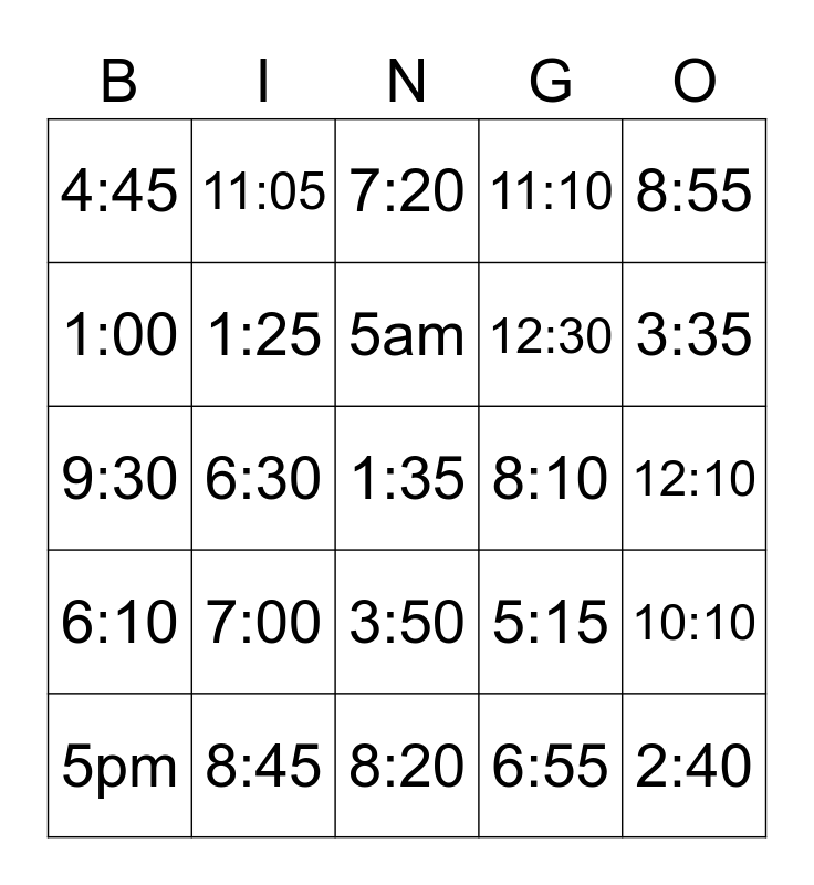 This bingo card has 30 words: 8:45, 12:15, 6:30, 2:00, 4:45, 7:20, 1:25, 3:50, 8:10, 8:20, 12:10, 1:35, 6:55, 2:40, 3:35, 4:05, 5:15, 6:10, 7:00, 8:55, 9:30, 10:00, 11:05, 12:30, 1:00, 11:10, 10:10, 5pm, 5am and 3pm.