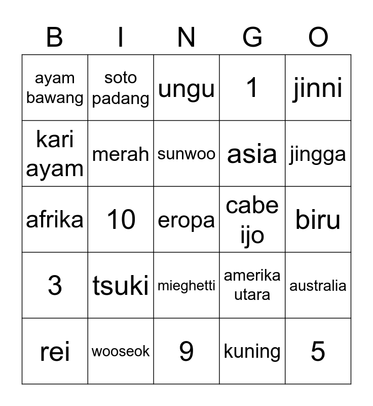 This bingo card has a free space and 24 words: tsuki, wooseok, sunwoo, rei, jinni, ayam bawang, kari ayam, soto padang, cabe ijo, mieghetti, asia, afrika, amerika utara, australia, merah, kuning, biru, ungu, jingga, 10, 5, 3, 1 and 9.