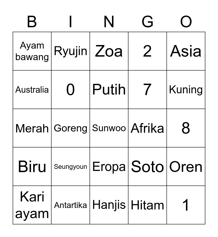 This bingo card has a free space and 24 words: Seungyoun, Antartika, Putih, Kari ayam, Asia, Ayam bawang, Australia, Ryujin, Afrika, Eropa, 7, Merah, Soto, Oren, 0, Hitam, 8, Zoa, Kuning, Goreng, 1, Biru, 2 and Hanjis.