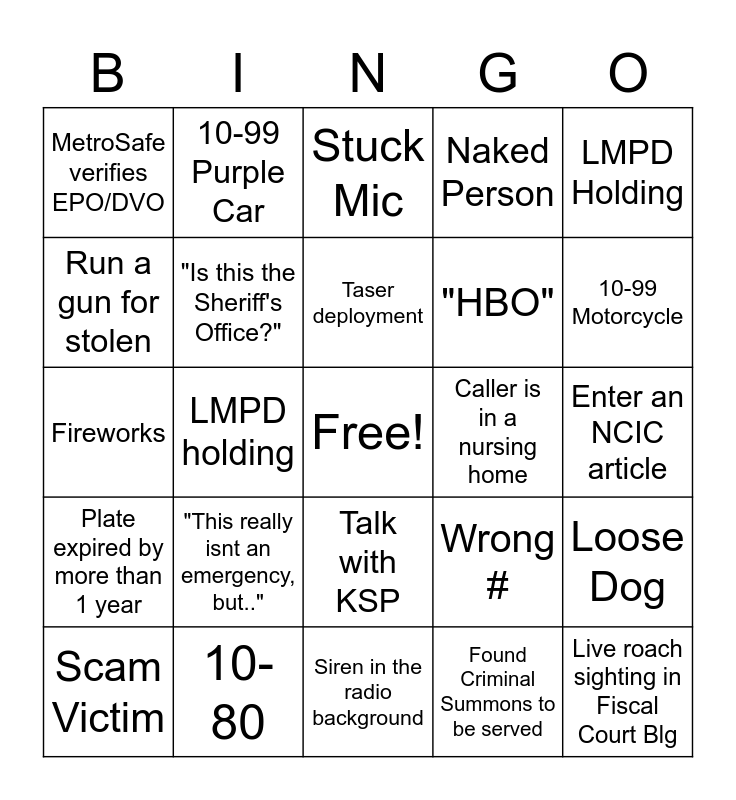 This bingo card has a free space and 24 words: "This really isnt an emergency, but..", 10-80, Taser deployment, Scam Victim, LMPD Holding, MetroSafe verifies EPO/DVO, Run a gun for stolen, 10-99 Purple Car, Caller is in a nursing home, Talk with KSP, "HBO", Fireworks, Wrong #, Loose Dog, "Is this the Sheriff's Office?", Found Criminal Summons to be served, Enter an NCIC article, Stuck Mic, 10-99 Motorcycle, LMPD holding, Live roach sighting in Fiscal Court Blg, Plate expired by more than 1 year, Naked Person and Siren in the radio background.