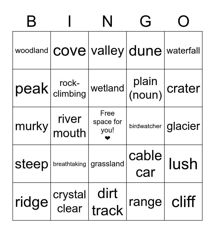 This bingo card has a free space and 24 words: breathtaking, crystal clear, wetland, ridge, waterfall, woodland, peak, cove, birdwatcher, grassland, plain (noun), murky, cable car, lush, rock-climbing, range, glacier, valley, crater, river mouth, cliff, steep, dune and dirt track.