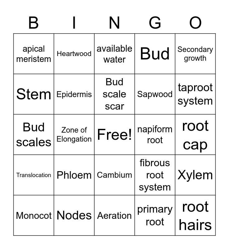 This bingo card has a free space and 31 words: Aeration, Roots, Zone of Elongation, Zone of maturation, apical meristem, available water, Epidermis, fibrous root system, napiform root, primary root, root cap, root hairs, secondary roots, Tertiary root, taproot system, unavailable water, Xylem, Phloem, Translocation, Cambium, Secondary growth, Dicot, Monocot, Heartwood, Sapwood, Stem, Bud, Bud scales, Nodes, Bud scale scar and Lenticel.