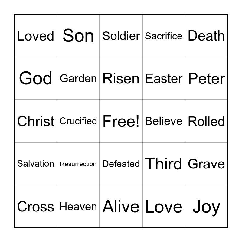This bingo card has a free space and 25 words: Resurrection, Alive, Risen, Cross, Death, Loved, God, Son, Believe, Defeated, Easter, Christ, Third, Grave, Garden, Stone, Rolled, Soldier, Peter, Crucified, Joy, Heaven, Salvation, Sacrifice and Love.