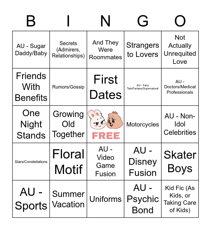 This bingo card has a free space and 77 words: Accidental Relationship, Alcohol/Drinking, And They Were Roommates, Banter as Flirting, Bets/Wagers, Coming of Age, Confessions (Love, or Otherwise), Domesticity, Enemies/Rivals to Lovers, Established Relationship, Exes, Fake/Pretend Relationship, First Dates, Friends With Benefits, Friends to Lovers, Growing Old Together, Hurt/Comfort, Kid Fic (As Kids, or Taking Care of Kids), Mutual Pining, Not Actually Unrequited Love, Oblivious Idiots, One Night Stands, Rumors/Gossip, Secrets (Admirers, Relationships), Strangers to Lovers, Third Party Meddling/Matchmakers, Truth or Dare (and Other Drinking Games), AU - 80s/90s/00s, AU - Actors/Hollywood, AU - Bodyguard, AU - Career Professionals, AU - College/University, AU - Coffee Shop, AU - Disney Fusion, AU - Doctors/Medical Professionals, AU - Fairy Tale/Fantasy/Supernatural, AU - High School, AU - Neighbors, AU - Non-Idol Celebrities, AU - Psychic Bond, AU - Reality Show, AU - Reincarnation/Past Lives, AU - Rock Band, AU - Royalty, AU - Soulmates, AU - Space, AU - Sports, AU - Sugar Daddy/Baby, AU - Superpowers, AU - Teachers, AU - TV Show/Book/Movie Fusion, AU - Video Game Fusion, Amusement Parks, Bar/Club Scenes, Beach/Seascape, Bed Sharing, Bubble Baths, Convenience Stores/Supermarkets, Different Time Era, Fireworks, Floral Motif, Food and Cooking, Guns/Weapons, Holding Hands, Holidays (eg. Christmas, Valentine's, Halloween, Etc.), Kisses, Libraries, Motorcycles, Pets/Animals (With and/or Turned Into), Road Trip, Seasonal Motifs (S/S/F/W), Skater Boys, Stars/Constellations, Summer Vacation, Tattoos, Uniforms and Weddings.