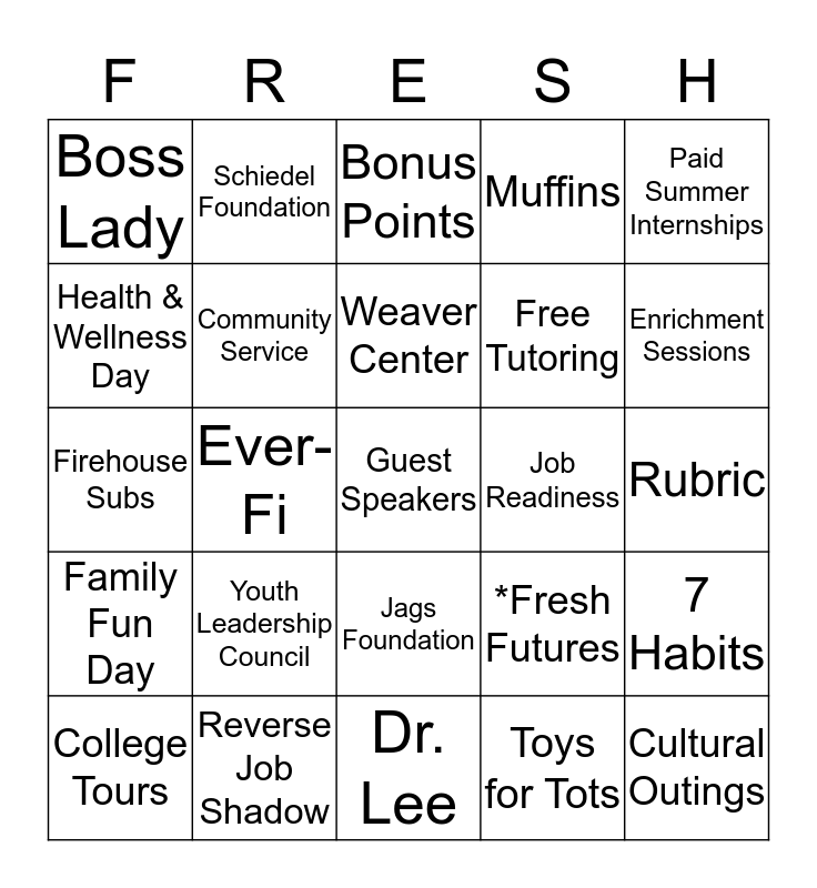 This bingo card has 25 words: Youth Leadership Council, Dr. Lee, Weaver Center, College Tours, Paid Summer Internships, Boss Lady, Health & Wellness Day, Schiedel Foundation, Job Readiness, Jags Foundation, Free Tutoring, Firehouse Subs, *Fresh Futures, 7 Habits, Community Service, Cultural Outings, Rubric, Bonus Points, Enrichment Sessions, Ever-Fi, Guest Speakers, Reverse Job Shadow, Family Fun Day, Muffins and Toys for Tots.