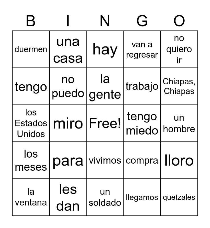 This bingo card has a free space and 29 words: la ventana, el autobús, miro, pienso, duermen, hay, no puedo, para, tengo miedo, les dan, un hombre, quetzales, un soldado, llegamos, Chiapas, Chiapas, Tijuana, México, vivimos, los meses, no quiero ir, los Estados Unidos, compra, boletos, trabajo, tengo, van a regresar, una casa, lloro, la gente and corren.