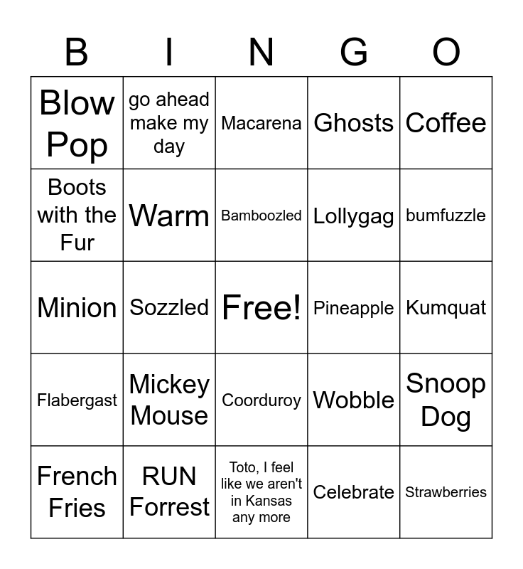 This bingo card has a free space and 24 words: Mickey Mouse, RUN Forrest, Bamboozled, French Fries, Coffee, Blow Pop, Boots with the Fur, go ahead make my day, Pineapple, Coorduroy, Lollygag, Minion, Wobble, Snoop Dog, Warm, Celebrate, Kumquat, Macarena, bumfuzzle, Sozzled, Strawberries, Flabergast, Ghosts and Toto, I feel like we aren't in Kansas any more.