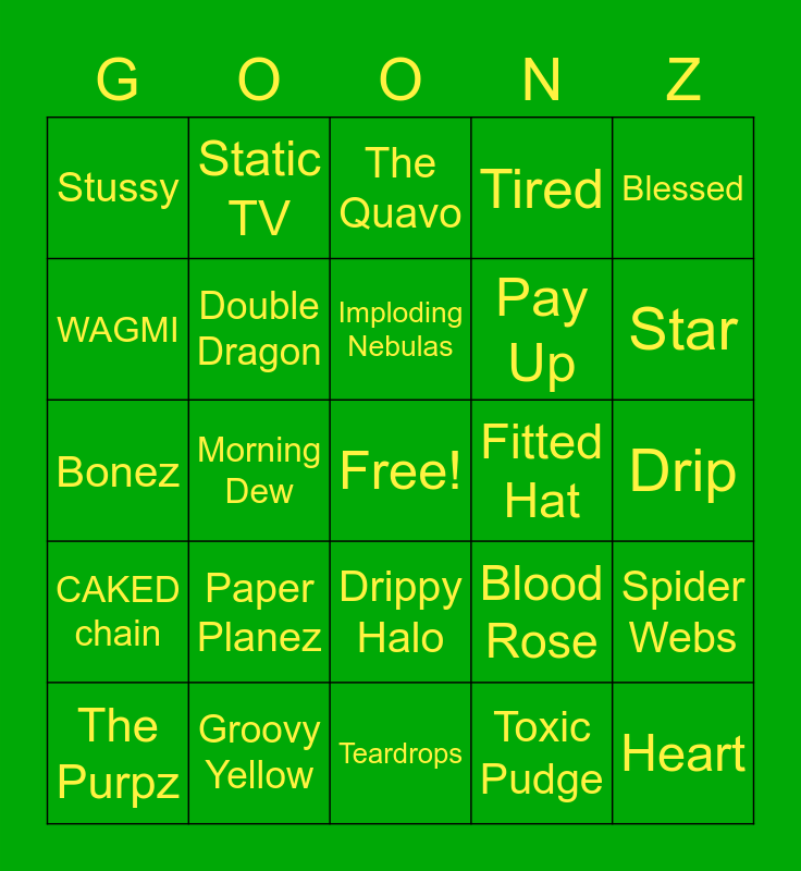 This bingo card has a free space and 24 words: Paper Planez, Groovy Yellow, Imploding Nebulas, The Purpz, Blessed, Stussy, WAGMI, Static TV, Fitted Hat, Drippy Halo, Pay Up, Bonez, Blood Rose, Spider Webs, Double Dragon, Toxic Pudge, Drip, The Quavo, Star, Morning Dew, Heart, CAKED chain, Tired and Teardrops.