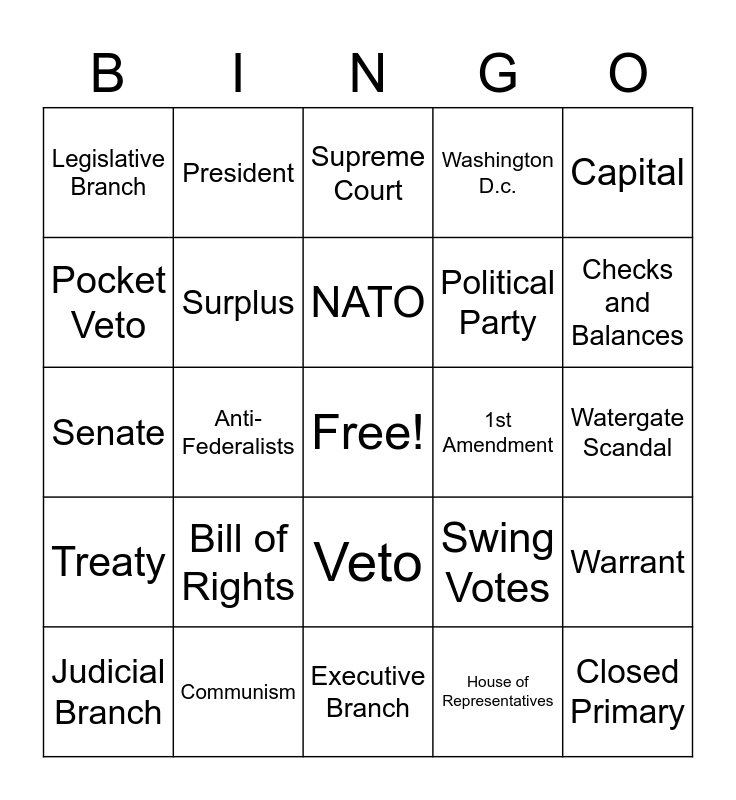 This bingo card has a free space and 44 words: Lebron James, Closed Primary, Federalist, Judicial Branch, Vice President, House of Representatives, Supreme Court, Law, Capital, Communism, Washington D.c., 1st Amendment, Veto, Bill of Rights, Constitution, Executive Branch, Miranda Rights, Senate, Citizen, Checks and Balances, President, Amendment, Electoral College, Legislative Branch, Tariff, Watergate Scandal, Unconstitutional, Terrorism, Swing Votes, Treaty, Visa, Warrant, Winner Take All, Writ of Habeas Corpus, Anti-Federalists, Bills, Ballot, Alien, NATO, Pocket Veto, Political Party, Suffrage, Surplus and Pardon.