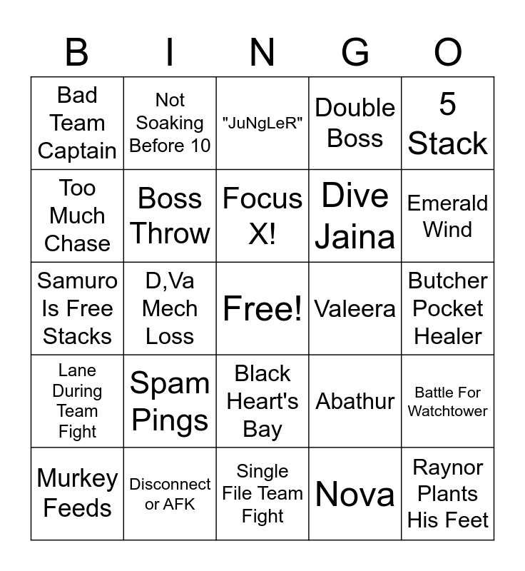 This bingo card has a free space and 25 words: Spam Pings, Single File Team Fight, Focus X!, Murkey Feeds, 5 Stack, Bad Team Captain, Too Much Chase, Not Soaking Before 10, Valeera, Black Heart's Bay, Dive Jaina, Samuro Is Free Stacks, Abathur, Battle For Watchtower, Boss Throw, Never Leaves Lane, Butcher Pocket Healer, "JuNgLeR", Emerald Wind, D,Va Mech Loss, Raynor Plants His Feet, Disconnect or AFK, Lane During Team Fight, Double Boss and Nova.