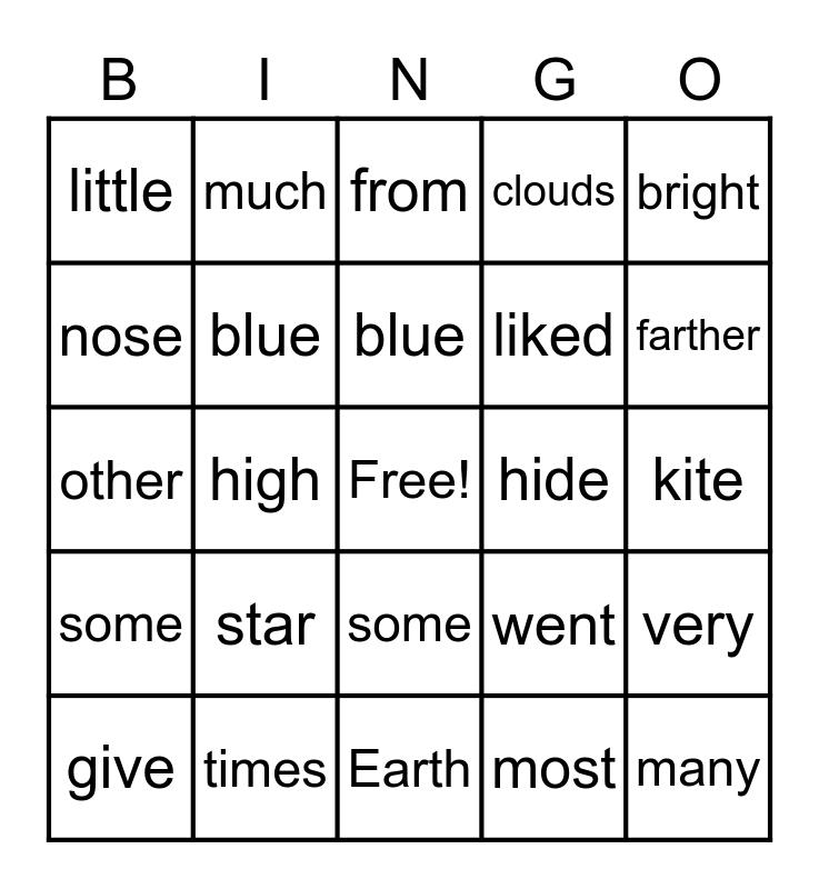 This bingo card has a free space and 44 words: light, many, things, give, Sun, most, from, very, bright, times, clouds, hide, some, star, close, Earth, seems, other, away, farther, much, fire, what, little, other, kite, day, park, went, some, were, very, grandpa, flying, high, ears, eyes, mouth, blue, nose, liked, everyone, blue and had.