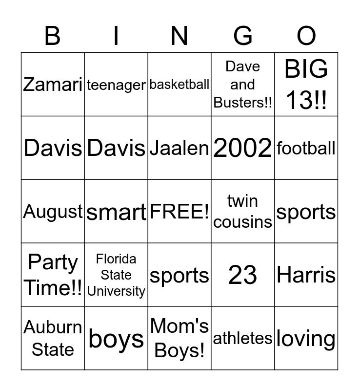 This bingo card has a free space and 24 words: Florida State University, boys, Jaalen, Auburn State, BIG 13!!, Zamari, Davis, teenager, twin cousins, sports, 2002, August, 23, Harris, Davis, athletes, sports, basketball, football, smart, loving, Party Time!!, Dave and Busters!! and Mom's Boys!.