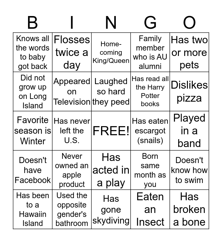 This bingo card has a free space and 24 words: Never owned an apple product, Used the opposite gender's bathroom, Laughed so hard they peed, Has been to a Hawaiin Island, Has two or more pets, Knows all the words to baby got back, Did not grow up on Long Island, Flosses twice a day, Has eaten escargot (snails), Has acted in a play, Has read all the Harry Potter books, Favorite season is Winter, Born same month as you, Doesn't know how to swim, Appeared on Television, Eaten an Insect, Played in a band, Home-coming King/Queen, Dislikes pizza, Has never left the U.S., Has broken a bone, Doesn't have Facebook, Family member who is AU alumni and Has gone skydiving.