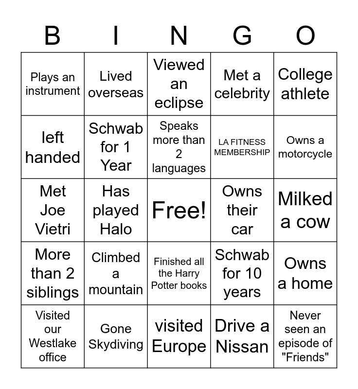 This bingo card has a free space and 24 words: Climbed a mountain, Gone Skydiving, Speaks more than 2 languages, Visited our Westlake office, College athlete, Plays an instrument, left handed, Lived overseas, Owns their car, Finished all the Harry Potter books, LA FITNESS MEMBERSHIP, Met Joe Vietri, Schwab for 10 years, Owns a home, Schwab for 1 Year, Drive a Nissan, Milked a cow, Viewed an eclipse, Owns a motorcycle, Has played Halo, Never seen an episode of "Friends", More than 2 siblings, Met a celebrity and visited Europe.