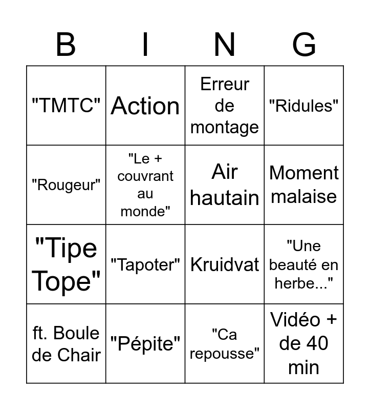This bingo card has 16 words: "Pépite", "Une beauté en herbe...", Erreur de montage, "TMTC", "Tipe Tope", Action, Kruidvat, "Ca repousse", "Rougeur", "Le + couvrant au monde", ft. Boule de Chair, "Ridules", "Tapoter", Moment malaise, Air hautain and Vidéo + de 40 min.
