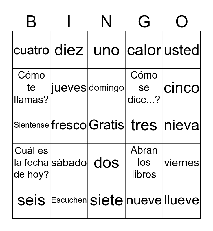 This bingo card has a free space and 37 words: lunes, martes, miércoles, jueves, viernes, sábado, domingo, tú, usted, frío, fresco, calor, llueve, nieva, Cómo te llamas?, Cuál es la fecha de hoy?, Qué día es hoy?, uno, dos, tres, cuatro, cinco, seis, siete, ocho, nueve, diez, De dónde eres?, Qué tiempo hace hoy?, Levanten la mano, Escriba la respuesta, Escuchen, Sientense, Cierren los libros, Abran los libros, Cómo se dice...? and Qué quiere decir...?.