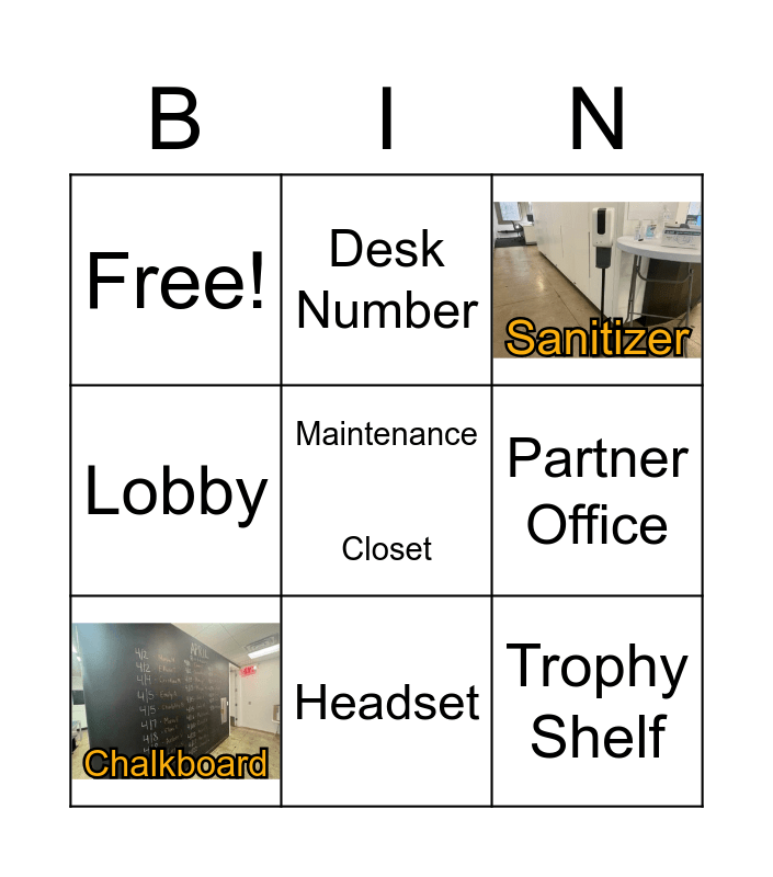 This bingo card has 13 images and 31 words: Pantry, Elevator, Prosek square, Copier, Free!, Sanitizer, Chalkboard, Bevi, Coffee Machine, Lockers, Monitor, Keyboard, Condeco, Conference Table, Plants, Stamp Machine, Binding Machine, Phone, Stapler, Supply Closet, Maintenance Closet, Bloomberg Terminal, Street Signs, Desk Number, Trophy Shelf, Partner Office, Lobby, Restrooms, Newspapers, Headset and TV.