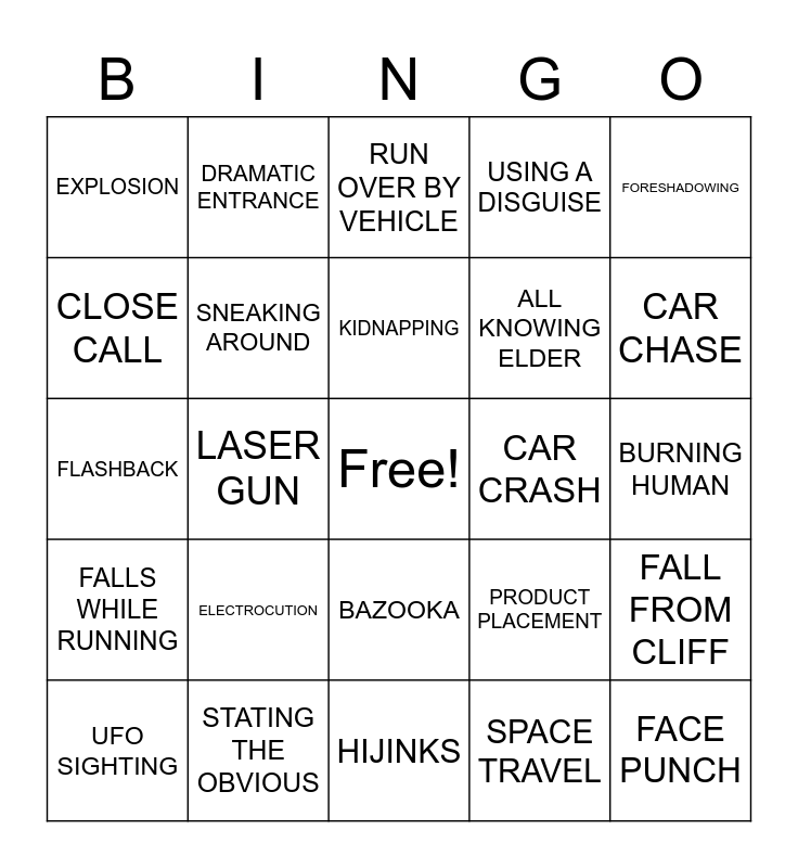 This bingo card has a free space and 24 words: UFO SIGHTING, ELECTROCUTION, KIDNAPPING, SPACE TRAVEL, FORESHADOWING, EXPLOSION, DRAMATIC ENTRANCE, RUN OVER BY VEHICLE, CAR CRASH, BURNING HUMAN, FLASHBACK, SNEAKING AROUND, PRODUCT PLACEMENT, FALL FROM CLIFF, CLOSE CALL, STATING THE OBVIOUS, HIJINKS, USING A DISGUISE, CAR CHASE, FALLS WHILE RUNNING, LASER GUN, BAZOOKA, ALL KNOWING ELDER and FACE PUNCH.