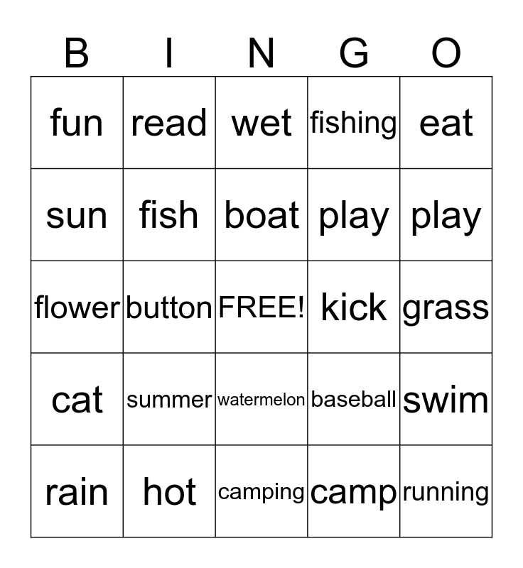 This bingo card has a free space and 24 words: summer, hot, boat, rain, eat, fun, sun, read, kick, watermelon, play, flower, baseball, swim, fish, camp, grass, wet, play, button, running, cat, fishing and camping.