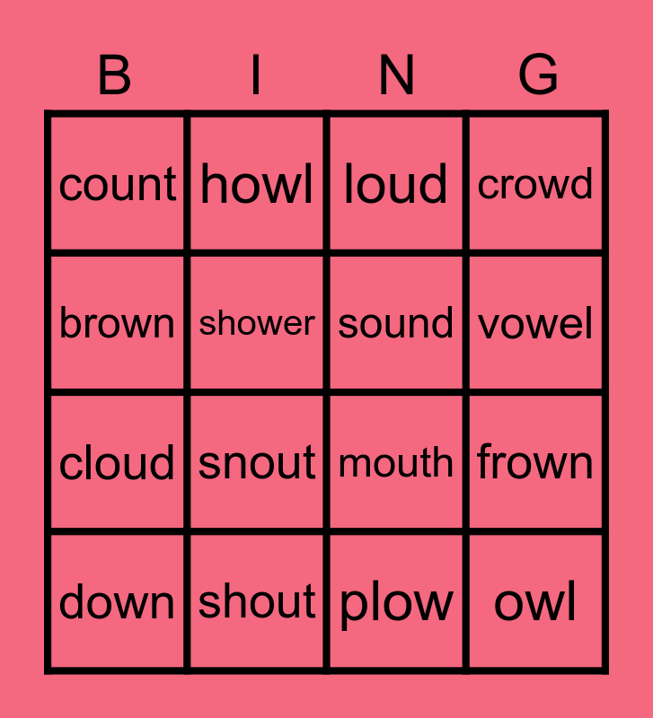 This bingo card has 20 words: frown, clown, loud, cow, down, brown, shout, count, cloud, howl, snout, mouth, shower, owl, sound, gown, vowel, crowd, plow and couch.