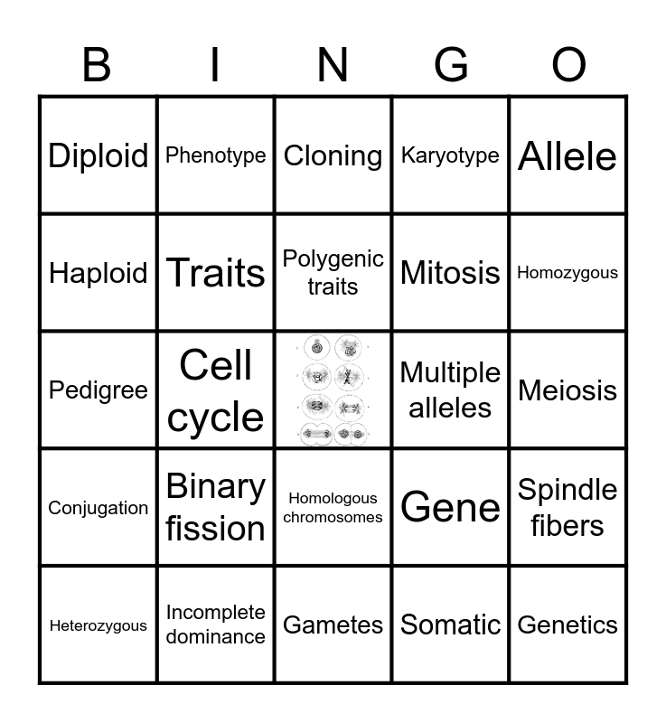 This bingo card has a free space and 34 words: Chromosomes, Somatic, Gametes, Sexual reproduction, Conjugation, Traits, Allele, Heterozygous, Phenotype, Codominance, Polygenic traits, Cloning, Genotype, Genetic engineering, Multiple alleles, Homozygous, Incomplete dominance, Pedigree, Binary fission, Gene, Homologous chromosomes, Crossing over, Diploid, Meiosis, Gametes, Genetics, Karyotype, Mutation, Mitosis, Haploid, Asexual reproduction, Cell cycle, Spindle fibers and Centromere.