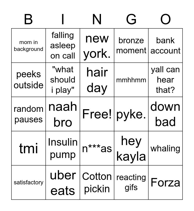 This bingo card has a free space and 24 words: Insulin pump, uber eats, hair day, satisfactory, bank account, mom in background, peeks outside, falling asleep on call, pyke., n***as, mmhhmm, random pauses, hey kayla, whaling, "what should i play", reacting gifs, down bad, new york., yall can hear that?, naah bro, Forza, tmi, bronze moment and Cotton pickin.