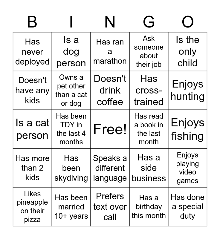 This bingo card has a free space and 24 words: Likes pineapple on their pizza, Has been skydiving, Doesn't drink coffee, Has a birthday this month, Is the only child, Has never deployed, Is a dog person, Has ran a marathon, Has read a book in the last month, Enjoys fishing, Is a cat person, Owns a pet other than a cat or dog, Has a side business, Enjoys playing video games, Doesn't have any kids, Has been married 10+ years, Prefers text over call, Ask someone about their job, Enjoys hunting, Has more than 2 kids, Has been TDY in the last 4 months, Speaks a different language, Has cross-trained and Has done a special duty.