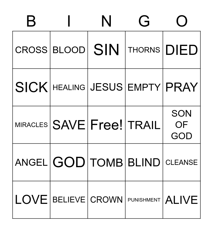 This bingo card has a free space and 24 words: LOVE, GOD, JESUS, PUNISHMENT, DIED, CROSS, BLOOD, SIN, TRAIL, SON OF GOD, MIRACLES, HEALING, BLIND, CLEANSE, SICK, BELIEVE, CROWN, THORNS, PRAY, ANGEL, SAVE, TOMB, EMPTY and ALIVE.